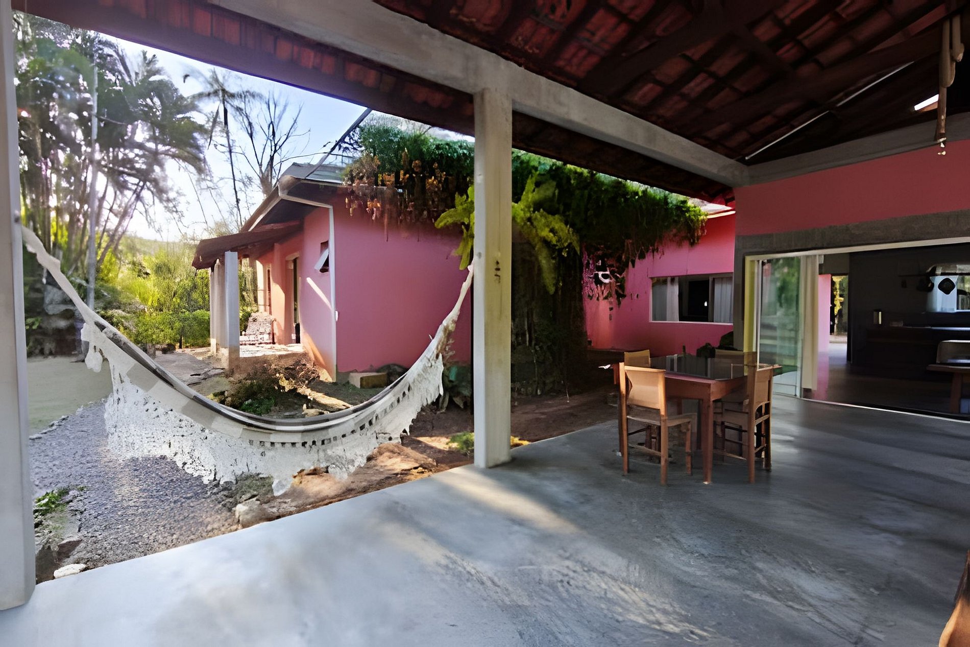 Jardim espaçoso com redes de descanso