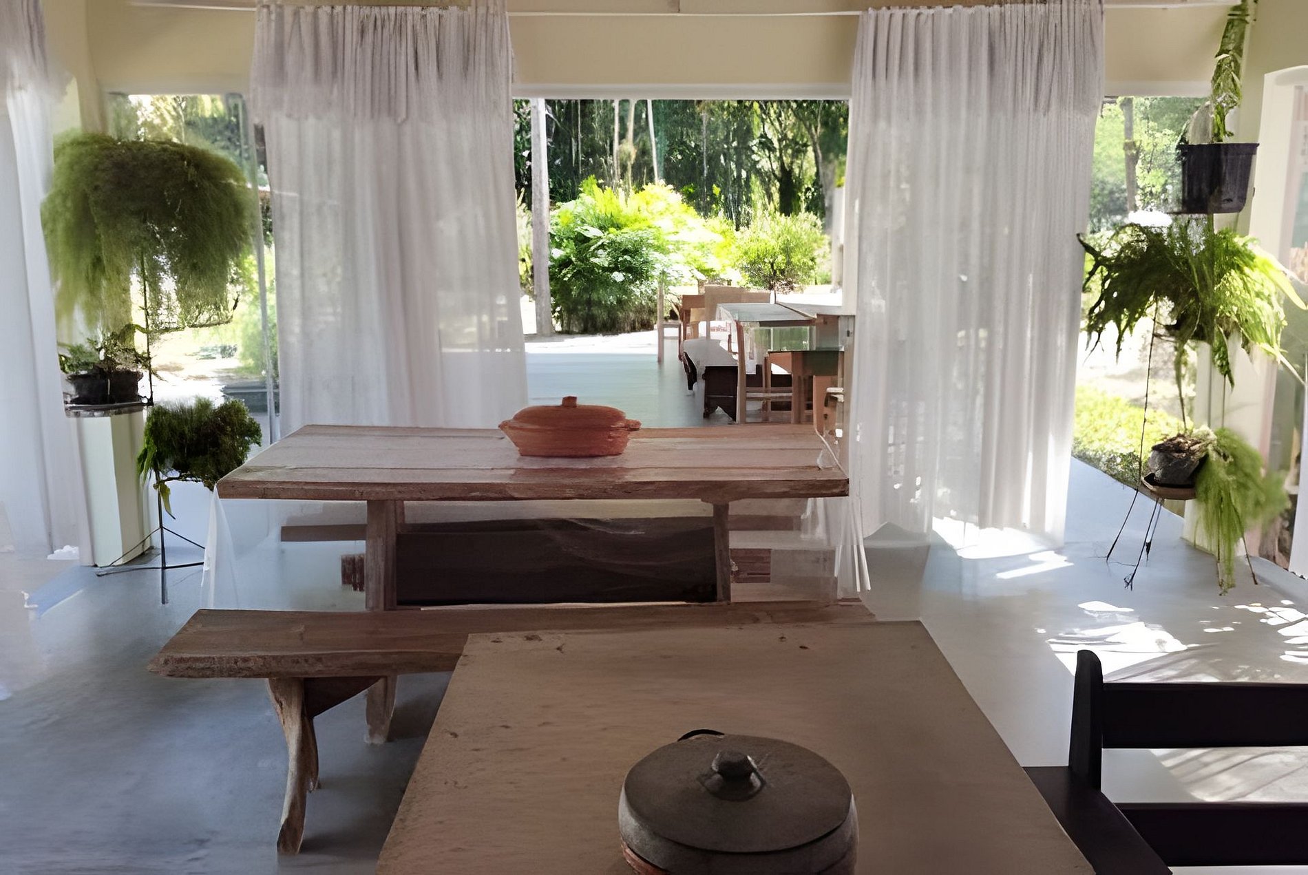 Jardim espaçoso com redes de descanso