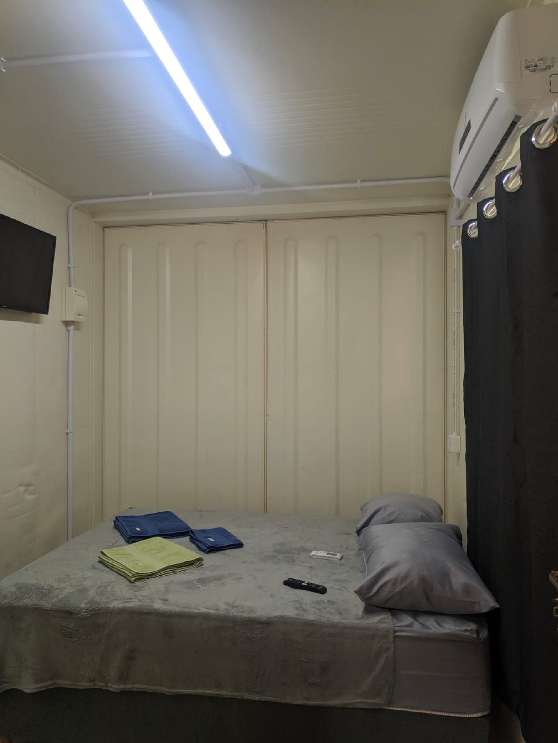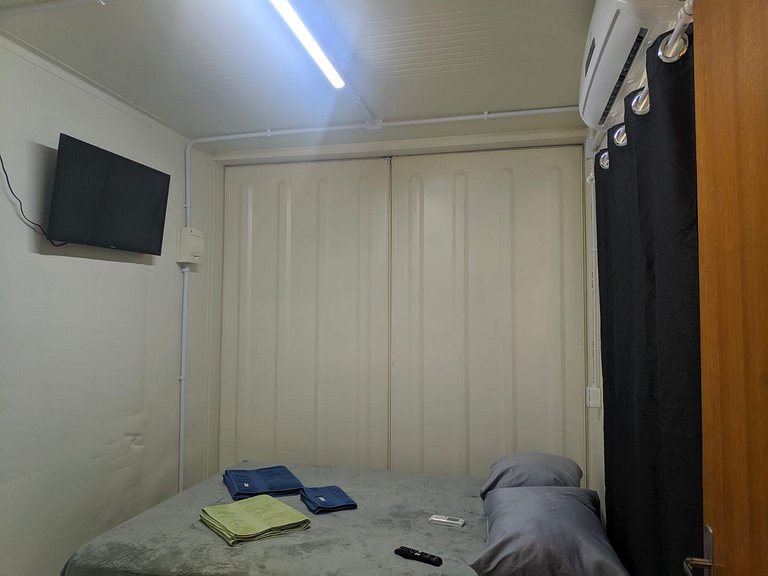Acomodações: Nosso container possui dois quartos confortáveis, ambos equipados com ar condicionado para garantir seu conforto em todas as estações do ano. Os quartos conta com Smart TV, perfeita para assistir seus programas e filmes favoritos após um dia de passeios.